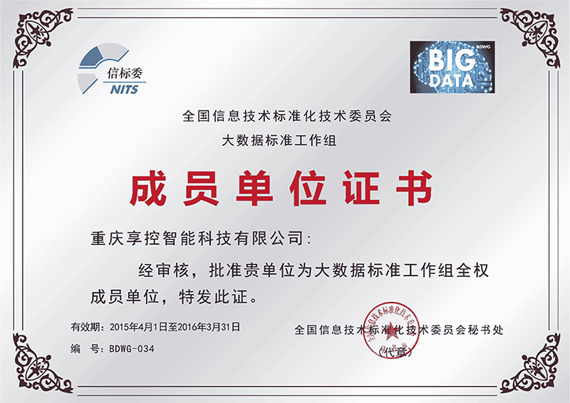 全國信標委批準重慶享控智能科技有限公司為“大數(shù)據(jù)標準工作組全權(quán)成員單位”
